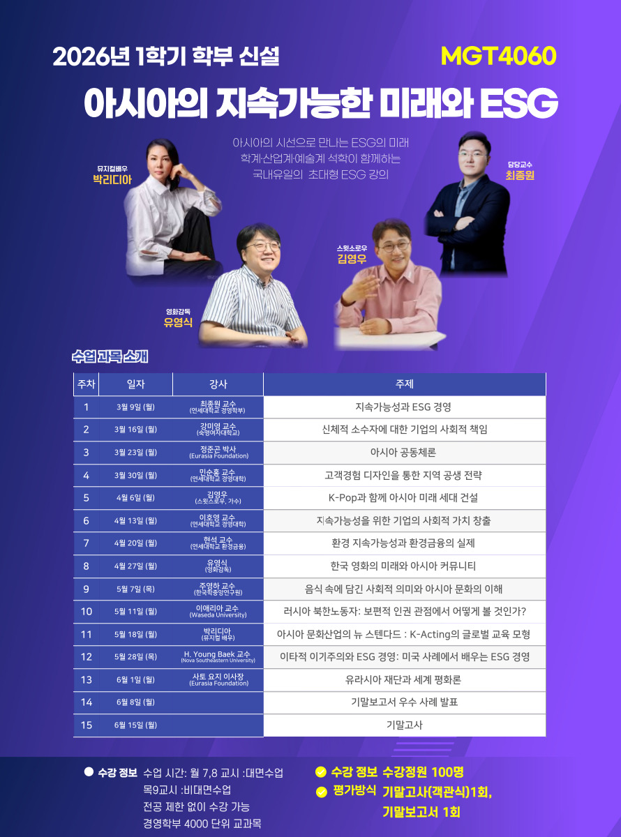 연세대학교 미래캠퍼스에서는 2026학년도 1학기부터 「아시아의 지속가능한 미래와 ESG」 교과목을 개설합니다. 관심있는 학생들의 적극적인 수강신청을 권장합니다.